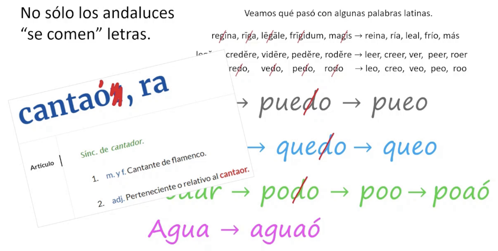 Es común oír que los hablantes de Andalucía, también de otras zonas, “se comen letras” cuando hablan. Desafortunada expresión que abarca un abanico de fenómenos lingüísticos que incluyen procesos fonológicos, cambios diacrónicos y otros matices sociofonéticos1 y dialectales.